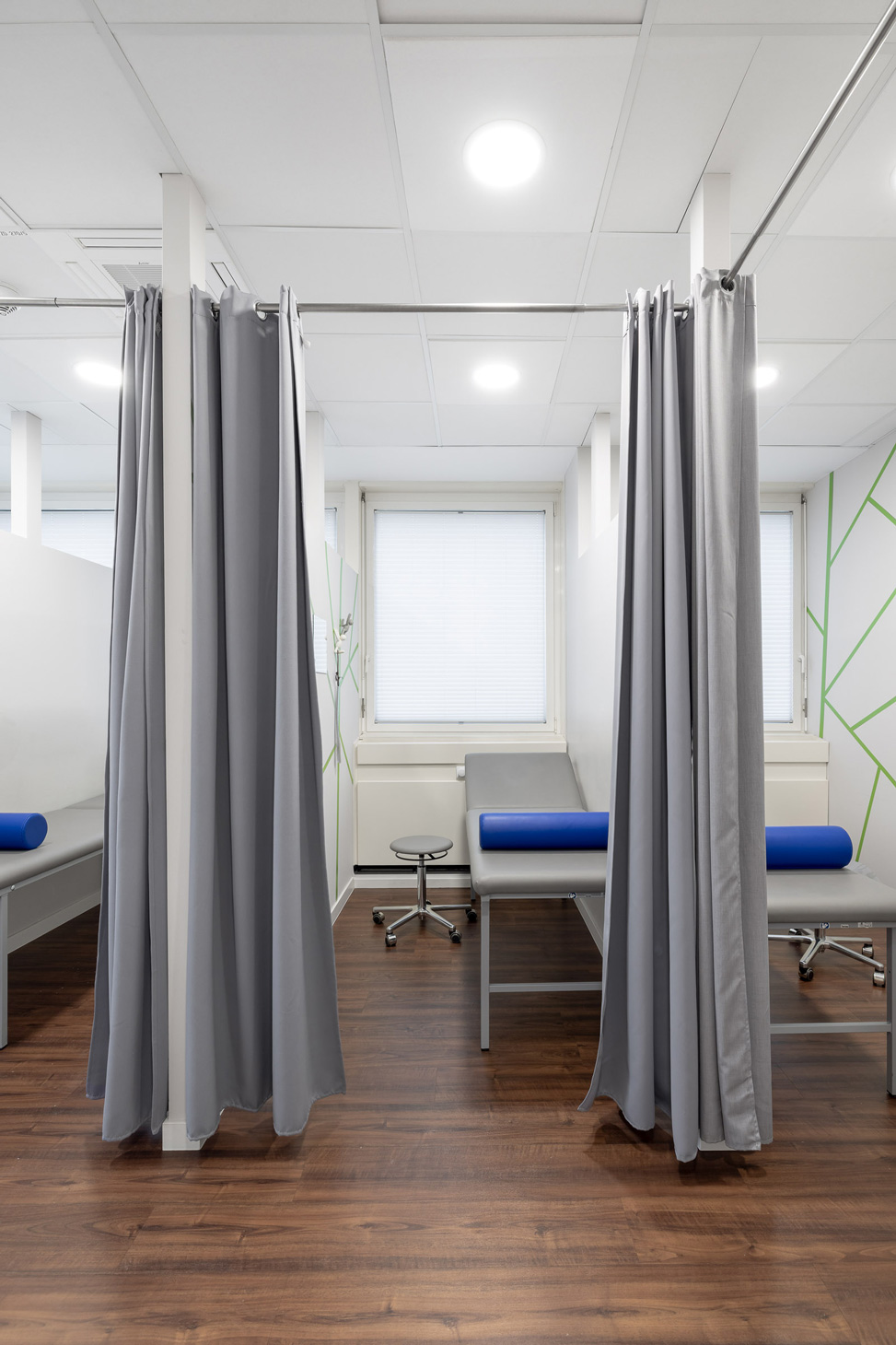 Die ehemalige Bürofläche wurde im Rahmen einer Umnutzung zu einer orthopädischen Arztpraxis ausgebaut. Auf rund 295 m² entstand eine klar zonierte Praxislandschaft mit Anmeldung, Wartebereichen, vier Behandlungs- und zwei Eingriffsräumen. Weitere multifunktional nutzbaren Räume, ein Röntgenraum, Umkleiden, Büro, Lager- und Nebenräume vervollständigen das Raumkonzept. Die Positionierung folgt funktionalen Abläufen und schafft zugleich visuelle Transparenz und Orientierung.