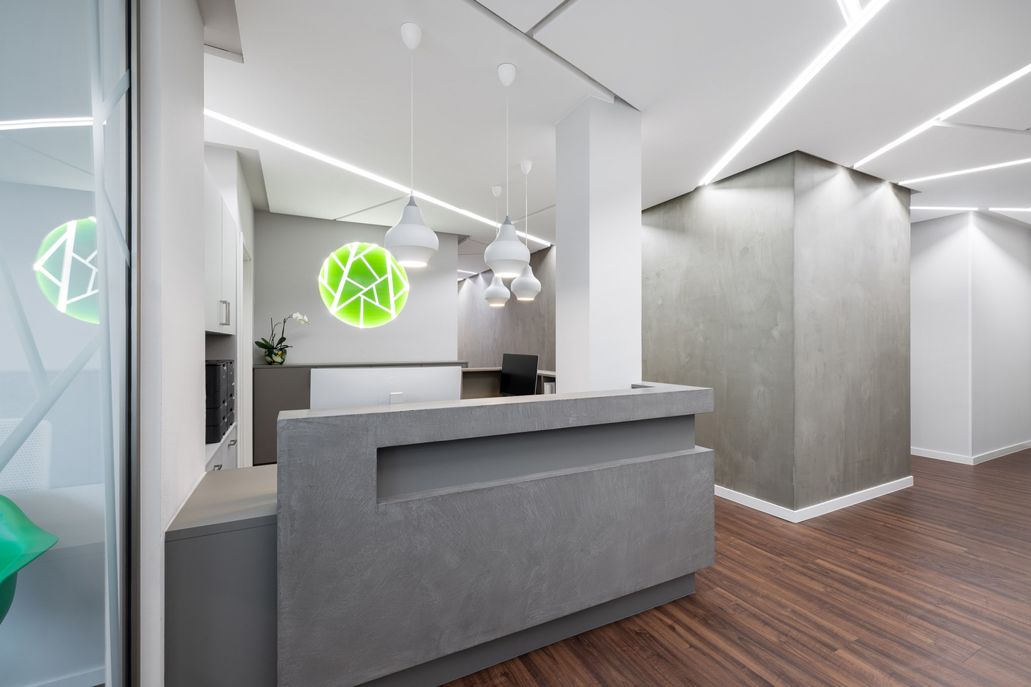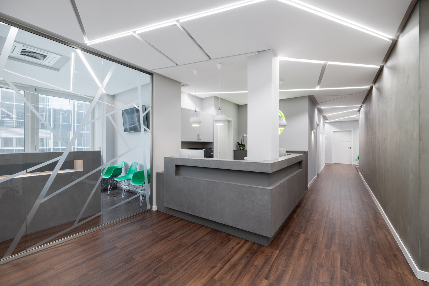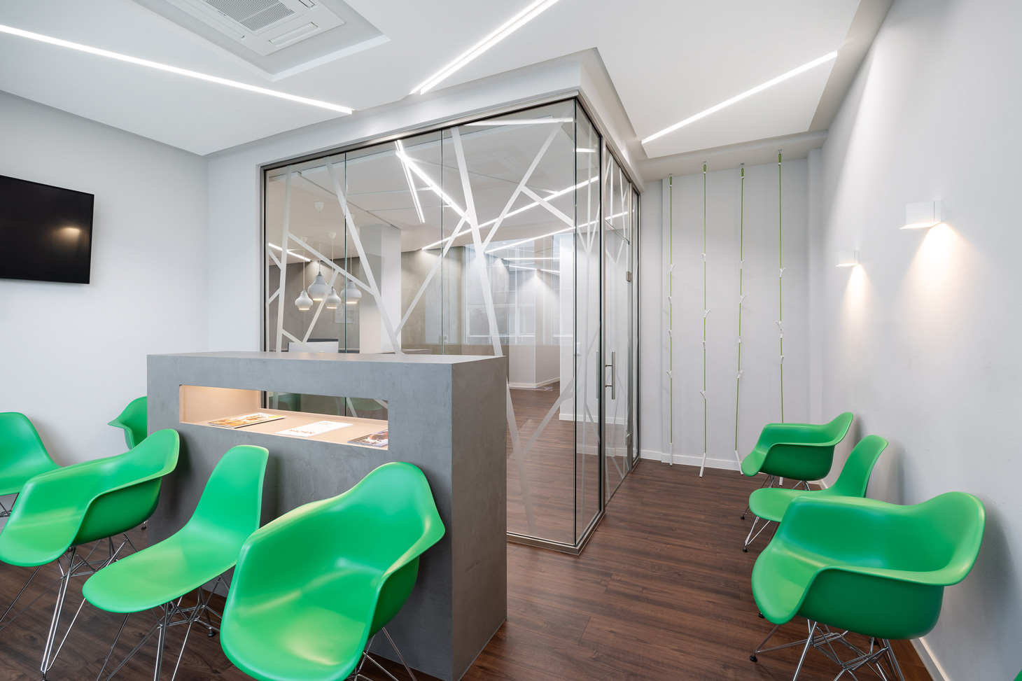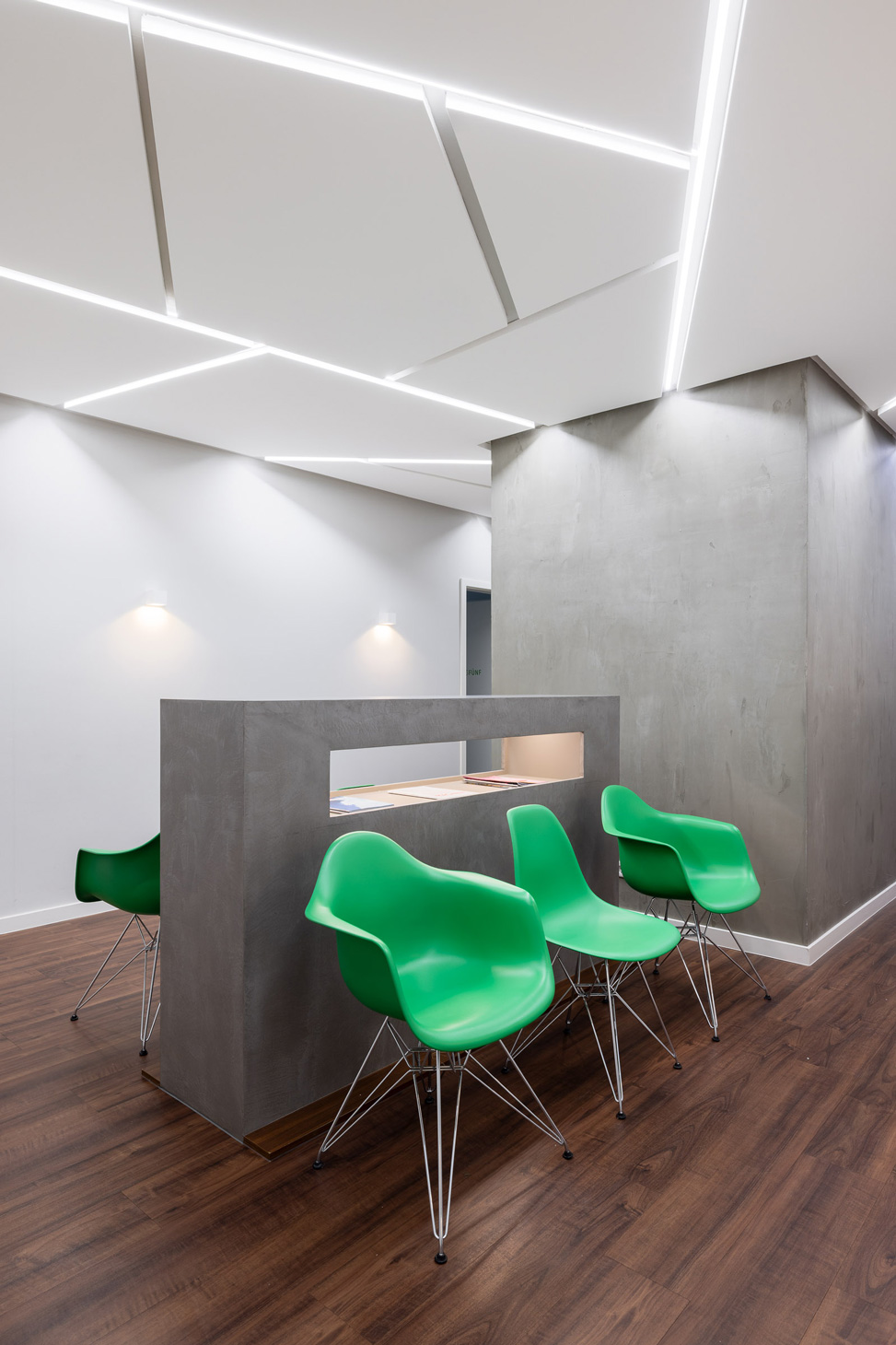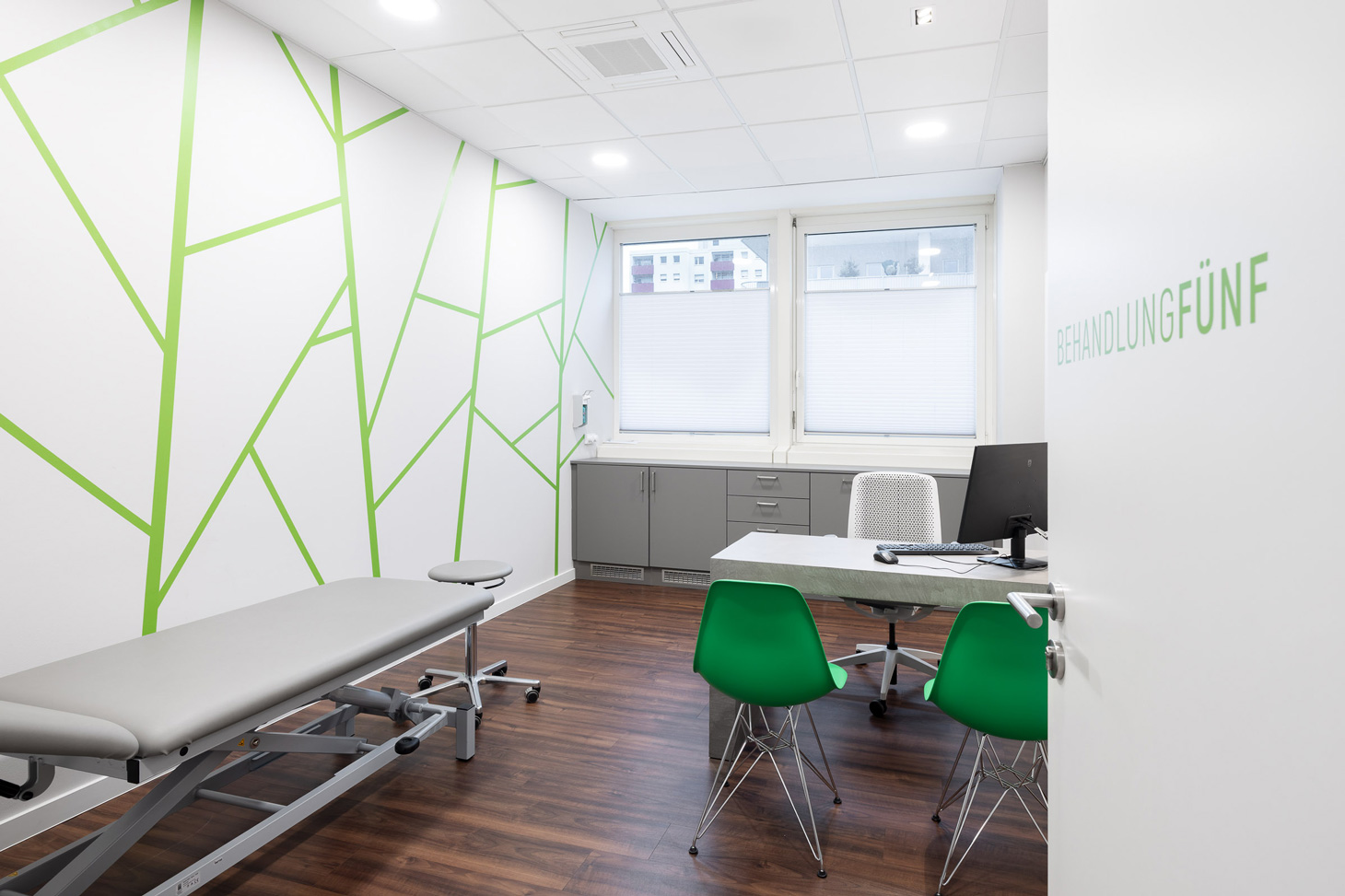 Das Corporate Design ist integraler Bestandteil des Entwurfs. Eine reduzierte Material- und Farbpalette aus Grau- und Weißtönen, akzentuiert durch ein prägnantes Grün und grafische Motive in abstrahierter Baumästhetik, übersetzt die Markenidentität in Raum. Die Gestaltung verbindet technische Präzision mit einer ruhigen, naturbezogenen Bildwelt und verleiht der Praxis eine eigenständige räumliche Signatur.