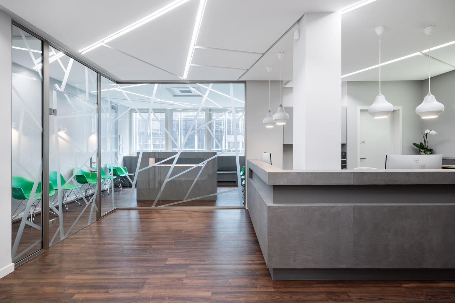 Die Materialität ist bewusst reduziert und robust gewählt. Oberflächen in Betonoptik prägen insbesondere den Empfangsbereich und verleihen den Räumen eine sachliche, zeitgemäße Anmutung. Glaswände stellen gezielte Sichtbezüge zwischen Erschließung, Wartebereichen und Funktionsräumen her und balancieren Offenheit und Diskretion. Grafische Layer ergänzen die Transparenz um eine identitätsstiftende visuelle Ebene.