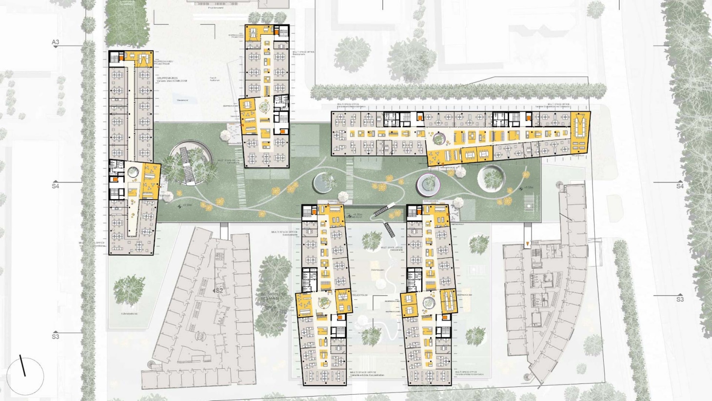Die Fiducia & GAD IT AG plant ihren Verwaltungssitz in Karlsruhe zu einem Campus weiterzuentwickeln. Vorhandene Gebäude sollen gleichberechtigt mit Ergänzungsbauten zu einem homogenen Ganzen verschmelzen und ein Netzwerk aus funktionalen und räumlichen Verbindungen und Wegeführungen entstehen. Die Verflechtung von grünen Außenräumen auf unterschiedlichen Ebenen mit Arbeits- und Kommunikationsflächen hat dabei einen hohen Stellenwert. Arbeiten, Entspannen und Erholen werden zusammengeführt und durch dienende Bereiche wie Kinderbetreuung und Sportflächenangebote ergänzt. Mit Erschließungskernen oder Stegen sind die Bauten an Wege und Infrastruktur angebunden. Ein hohes Maß an Robustheit und Anpassungsfähigkeit an wechselnde Anforderungen an die Funktionsflächen ist gegeben, ebenso eine wirtschaftliche Realisierbarkeit in zeitlichen Teil-Abschnitten.